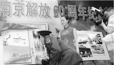 4月23日,江蘇省南京郵政局聯(lián)手南京總統(tǒng)府景區(qū)隆重舉行南京****60周年紀(jì)念活動。南京局為此次活動專門設(shè)計開發(fā)了《紀(jì)念南京****60年》總統(tǒng)府門票郵折。圖為郵折圖案的作者、著名畫家陳堅(jiān)為該郵折揭幕簽名。