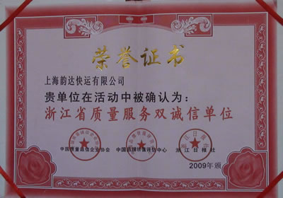 2009年4月,在浙江日?qǐng)?bào)社和中國質(zhì)量誠信企業(yè)協(xié)會(huì)、中國品牌價(jià)值評(píng)估中心聯(lián)合舉辦的“浙江省公眾滿意質(zhì)量服務(wù)雙誠信單位”的評(píng)選活動(dòng)中,通過市場(chǎng)調(diào)研、客戶反映、公眾投票等多種不同方式的綜合評(píng)比之后,上海韻達(dá)貨運(yùn)有限公司(韻達(dá)快運(yùn))喜獲“浙江省質(zhì)量服務(wù)雙誠信單位”稱號(hào)。獲得該榮譽(yù),意味著韻達(dá)快運(yùn)的品牌在浙江省消費(fèi)者中的認(rèn)知度很高,韻達(dá)快運(yùn)的服務(wù)在廣大消費(fèi)者中獲得了認(rèn)可。